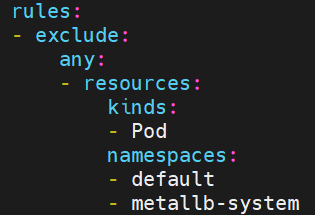 따라서 각 정책에서 exclude 부분의 namespace에 metallb-system 을 추가해줍니다.