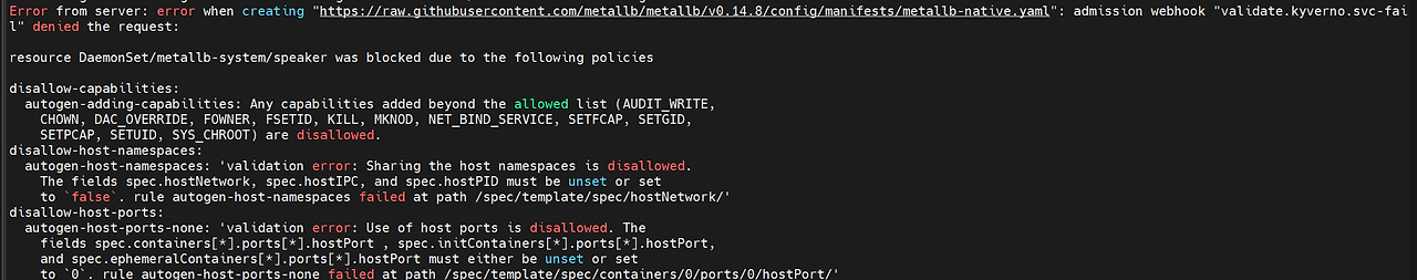 Error from server: error when creating "https://raw.githubusercontent.com/metallb/metallb/v0.14.8/config/manifests/metallb-native.yaml": admission webhook "validate.kyverno.svc-fail" denied the request: