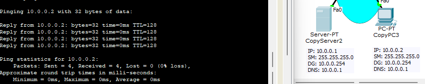 그러면 위와 같이 스위치, 서버, PC에 초록불이 들어오고 터미널에서 ping 테스트를 하여 설정이 잘 되었는지 확인을 한다.