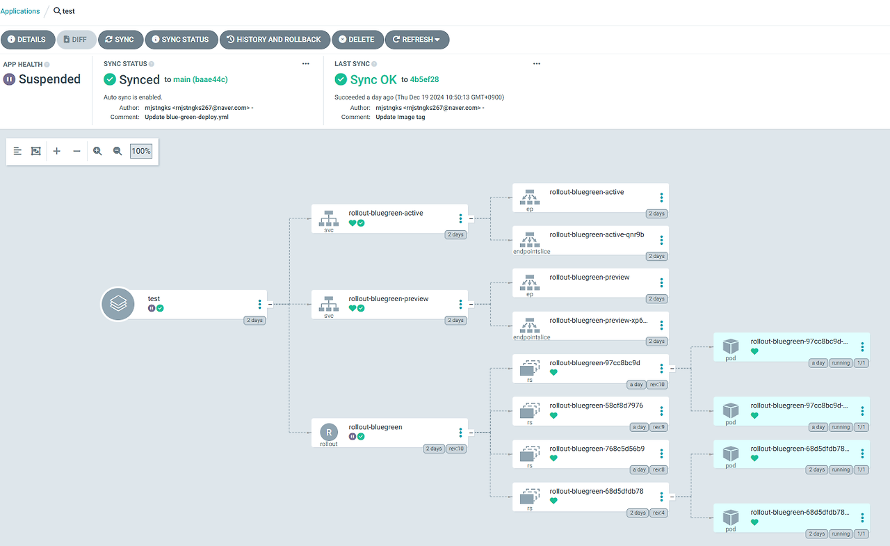 Application이 정상적으로 등록이 되면, Github 레포지터리에 있는 rollout.yaml