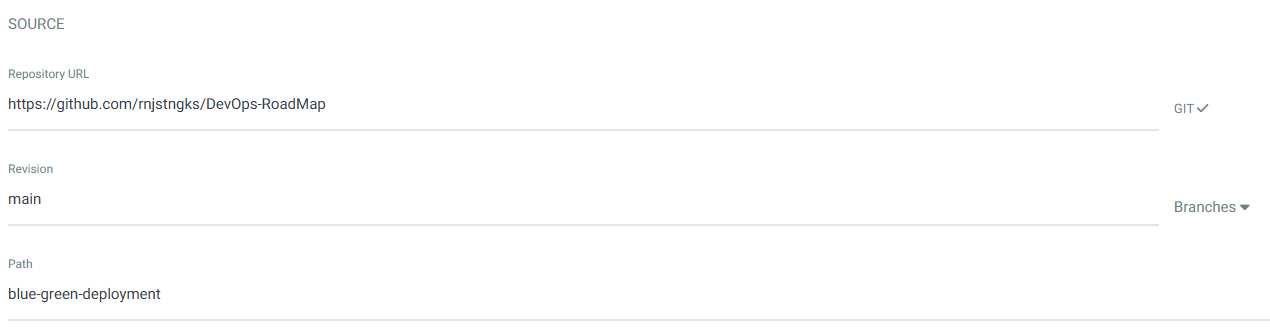 앞서 등록해준 Github Repository를 Source로 선택하여 Application 생성을 해줍니다.