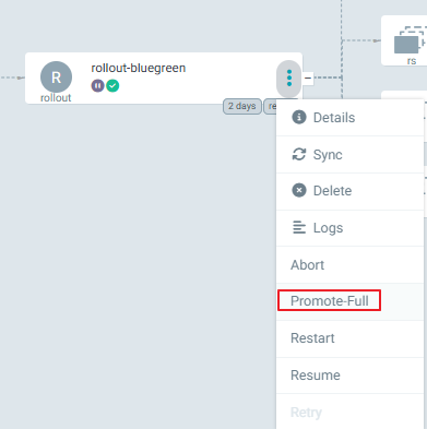 ArgoCD 대시보드에서 rollout 리소스를 선택하고 Promote-Full을 클릭해줍니다.