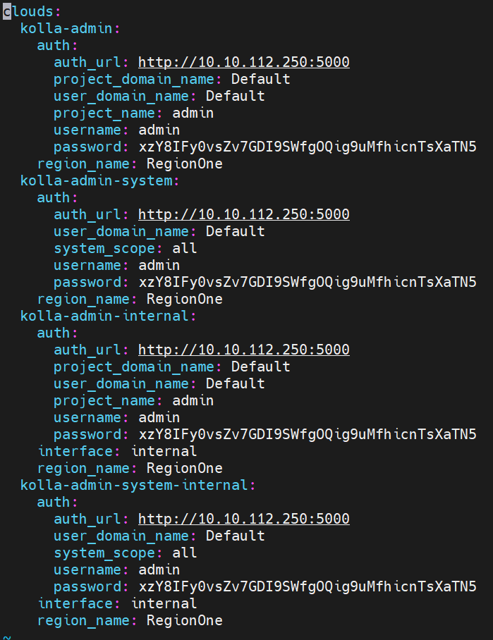 그러면 /etc/kolla/clouds.yaml 파일이 생성되고 해당 내용을 보면 아래와 같습니다.