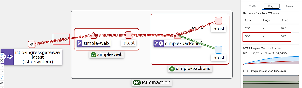 이제 주기적으로(75%) 실패하는 simple-backend-1 서비스 버전을 배포해보겠습니다.