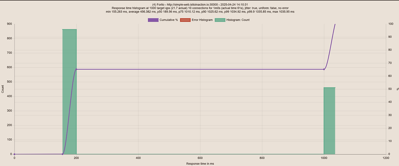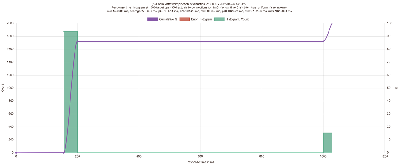 $ fortio load -quiet -jitter -t 30s -c 1 -qps 1 --allow-initial-errors http://simple-web.istioinaction.io:30000