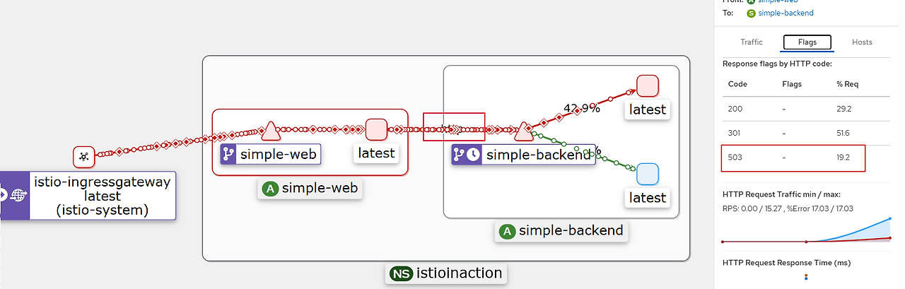 이 경우 엔드포인트 셋 중 하나(simple-backend-1)는 그림 6.12처럼 호출 중 75%에 HTTP 503 반환합니다.