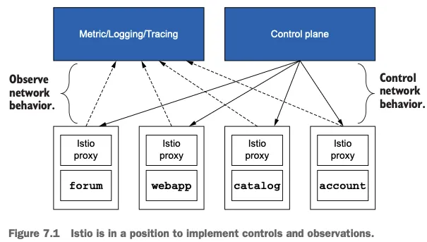 위 그림을 보면, Istio는 애플리케이션 앞에 사이드카 프록시 (Envoy)가 동작하므로, 애플리케이션 요청의 네트워크 수준에서 관찰 하기 좋습니다.