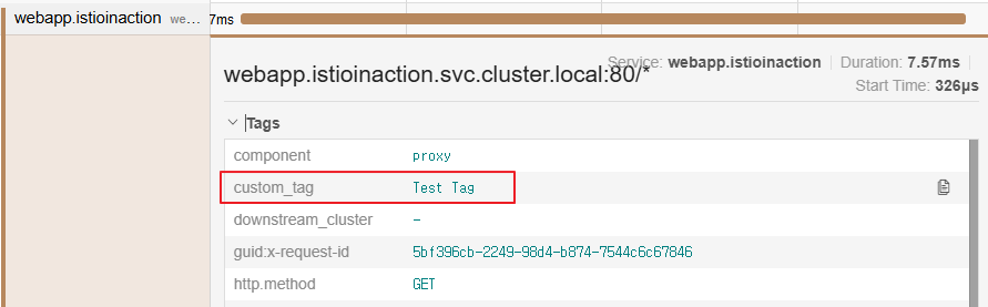 Jaeger UI에서 확인해보면, custom_tag=Test Tag 가 추가된 것을 확인 할 수 있습니다.