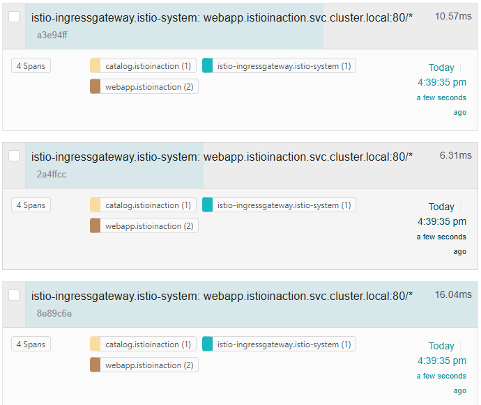 $ for in in {1..10}; do curl -s http://webapp.istioinaction.io:30000/api/catalog ; sleep 0.5; done