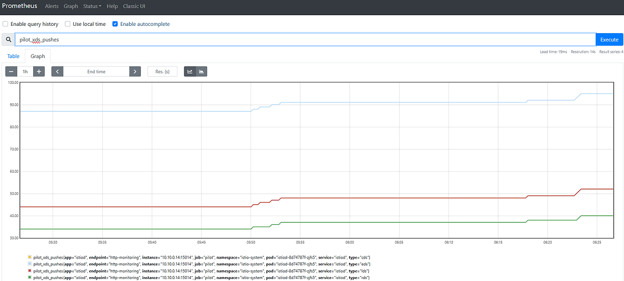 그래서 Prometheus 그래프에서 보면, 각 xDS 타입 별로 Push를 진행했던 횟수가 나옵니다.