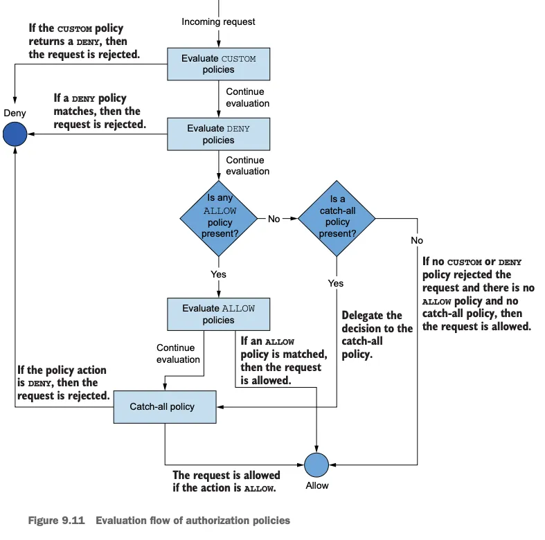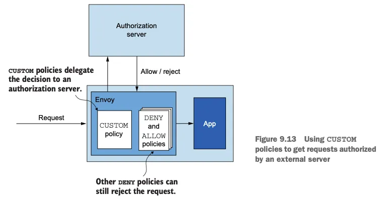 - AuthorizationPolicy 에서 CUSTOM action을 사용하면 외부 인가 서비스를 통합할 수 있다.