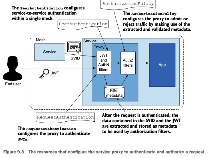 - AuthorizationPolicy 는 워크로드 ID 인증서나 최종 사용자 JWT에서 추출한 검증 가능한 메타데이터를 근거로 서비스 사이의 요청이나 최종 사용자의 요청을 인가(허용, 차단)하는 데 사용한다.