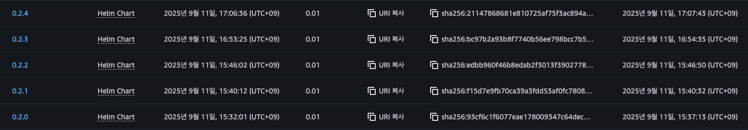helm push *-<version>.tgz oci://ECR 주소/그러면 아래 이미지 처럼 ECR에 Helm Chart 가 생기게 됩니다.