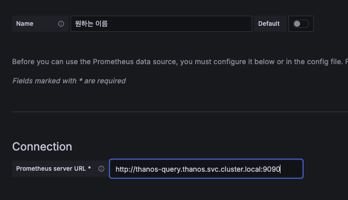 Connection에는 thanos-query의 서비스 도메인을 적어주면 됩니다.
