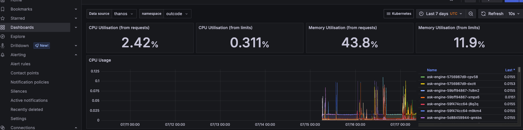 이제 대시보드에 가서 Data source를 thanos로 변경해주고 잘나오는지 확인해주면 됩니다.