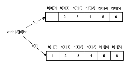 즉 배열 b는 [6]int 배열이 2개가 있는 다중 배열이라고 이해하시면 됩니다.
