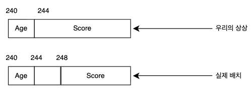 그런데, Age는 4바이트 공간을 차지하기 때문에 바로 붙어서 Score 필드를 할당하면 Score 필드의 시작주소가 244번지가 되어 8의 배수가 아니라 성능 손해를 봅니다.
