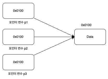 포인터를 이용하면 동일한 메모리 공간을 여러 변수가 가리킬 수 있습니다.