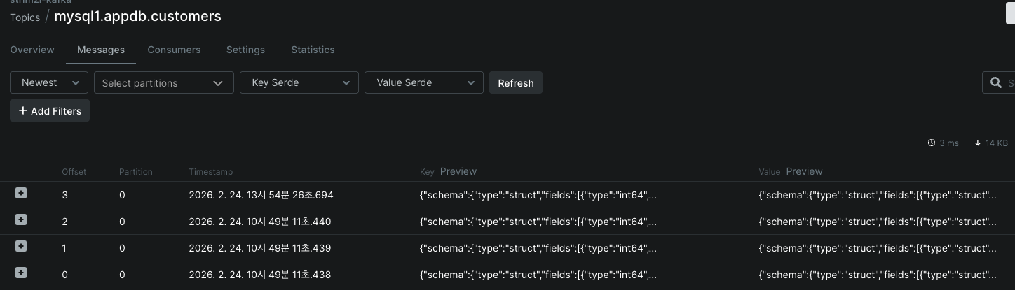 - CDC Topics: 실제 변경 이벤트가 쌓이는 Kafka 토픽들입니다.