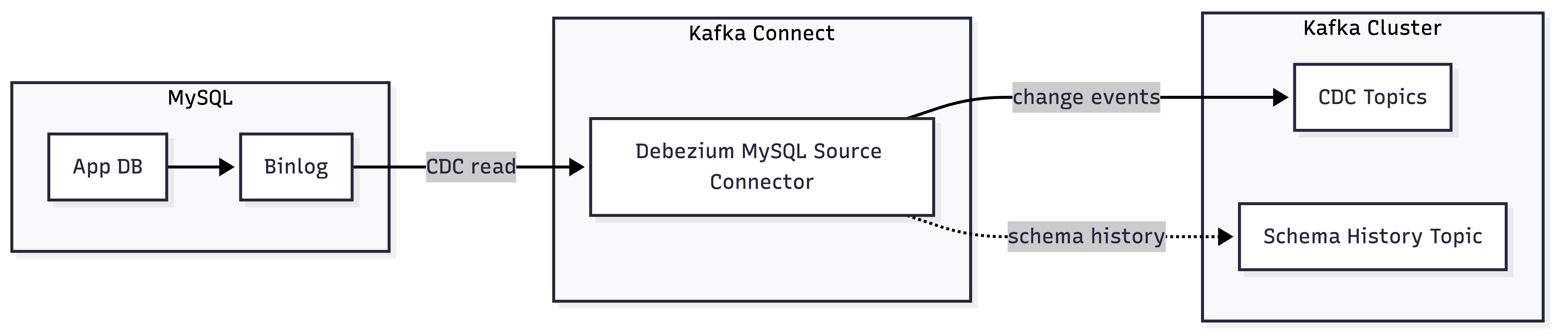- Binlog -> Kafka Connect: Debezium Connector가 변경 로그 읽음 (CDC read)