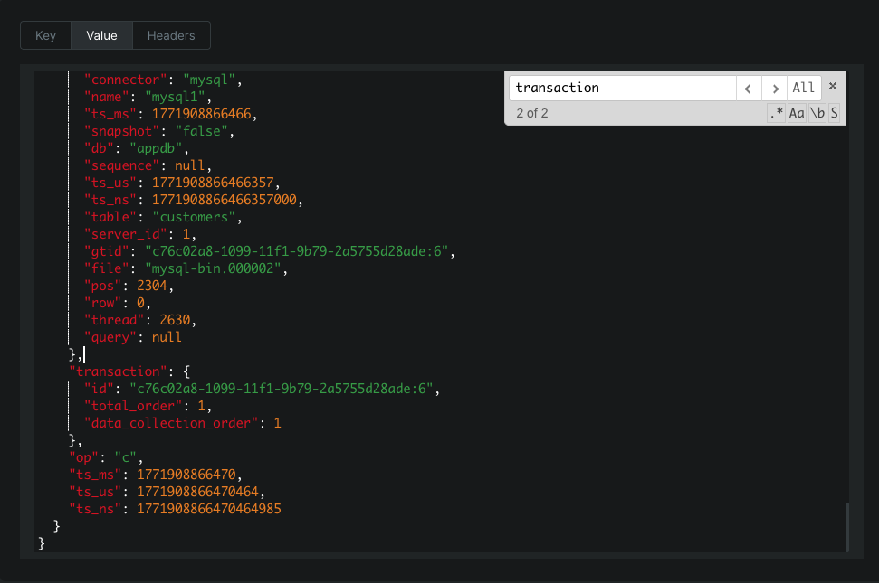 Debezium은 Kafka 토픽에 메시지를 보낼 때 Kafka Message Key = MySQL PK 값으로 매핑합니다.