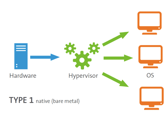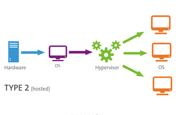 이 경우 게스트 OS는 호스트에서 프로세스로 실행되는 반면 하이퍼바이저는 게스트 OS와 호스트 OS를 분리한다.