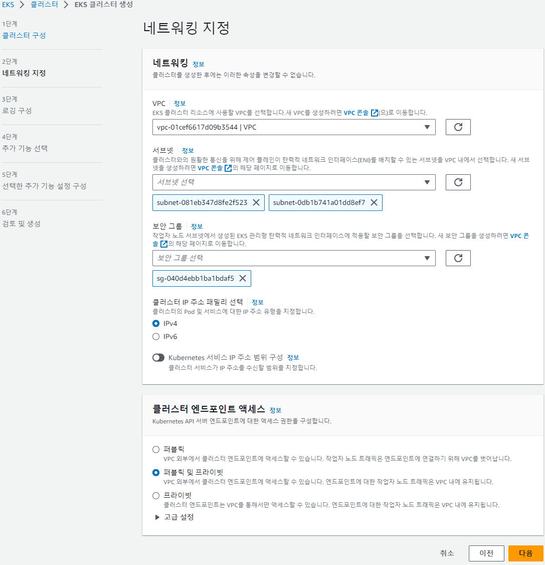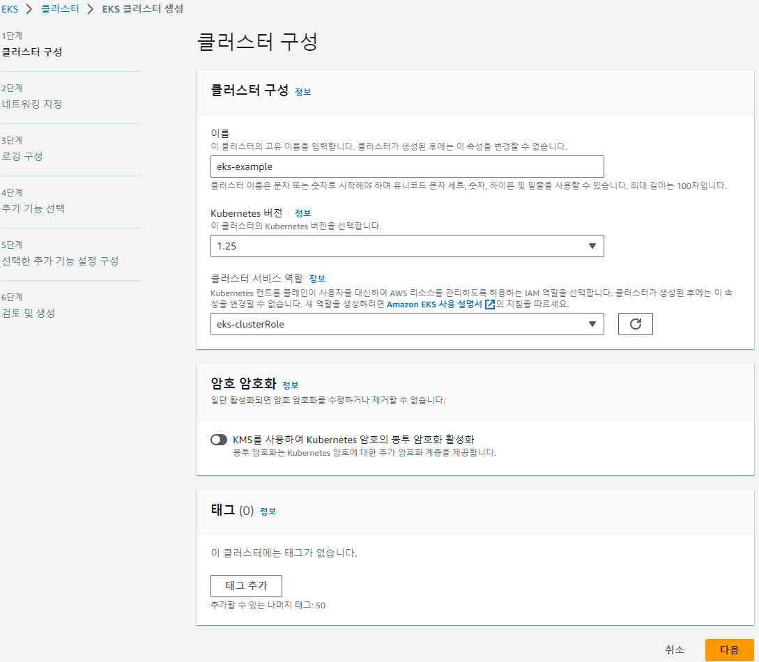 이렇게 생성을하고 뒤에 항목들은 다음만 계속 누르면 EKS 클러스터가 생성이 된다.