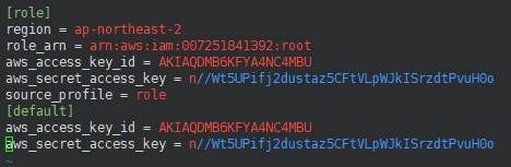 1-1 vi /root/.aws/credentials 처음에는 [default]만 존재합니다. 아래 사진과 동일하게 [role] 정보를 입력을 해줍니다.