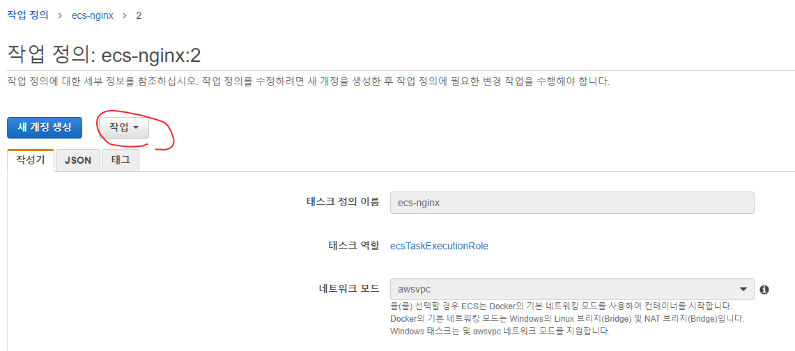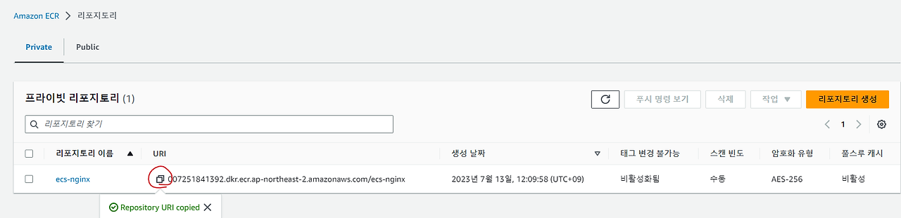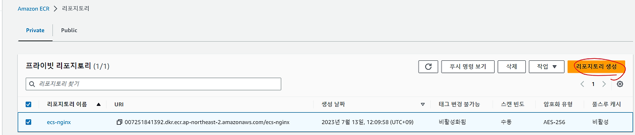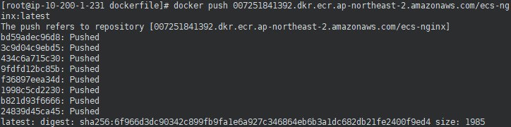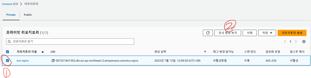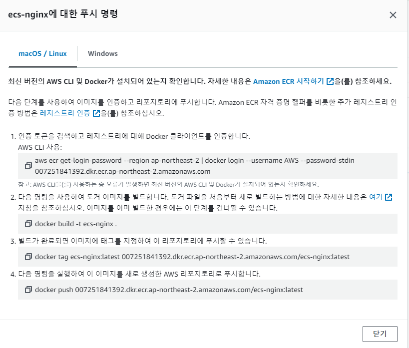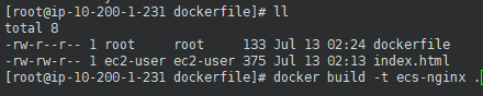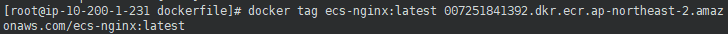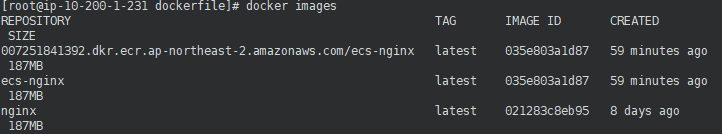 2번 명령어 실행 명렁어를 실행 하기 이전에 dockerfile을 만들어 두고 docker build -t ecs-nginx . 실행해줘야한다.
