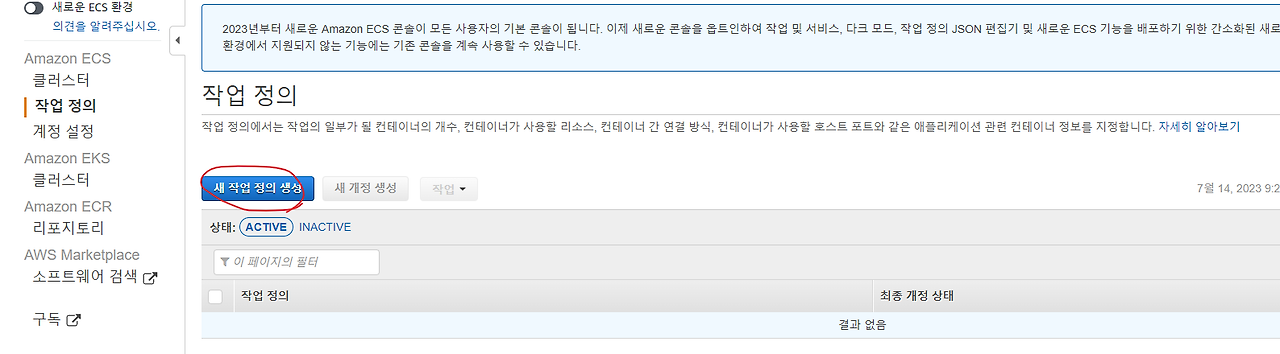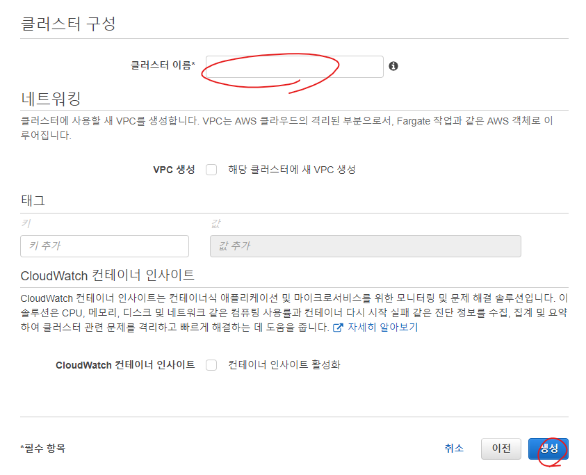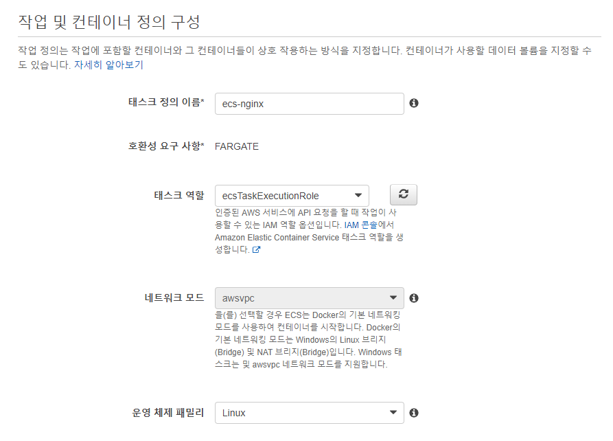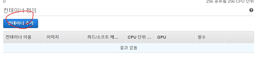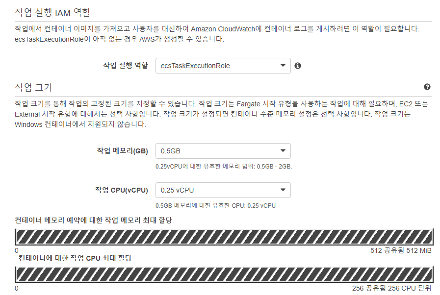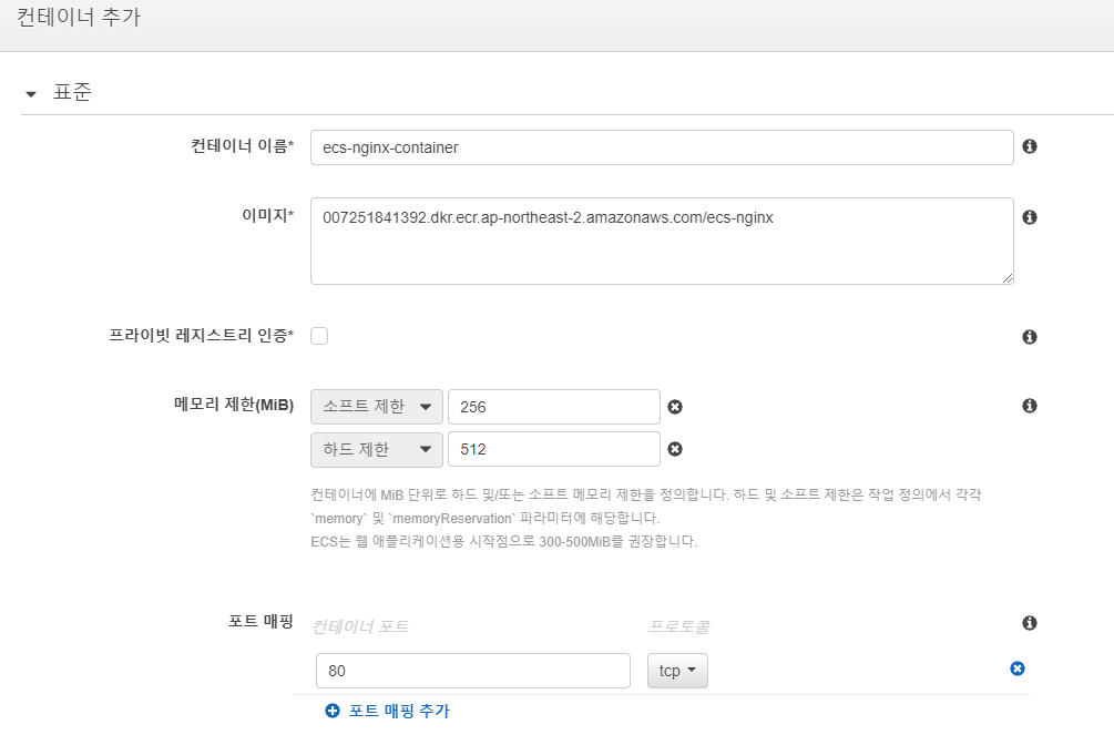 작업 정의 fargate로 작업을 생성 해준다. 여기서 중요한 것은 이미지를 만든 것을 ECR에 넣어주었으니, 컨테이너를 만들 때 사용하는 이미지는 ECR의 레포지토리 URI를 복사해서 넣어주어야 한다. 소프트 제한이 최소 메모리 사용량, 하드 제한이 최대 메모리 사용량