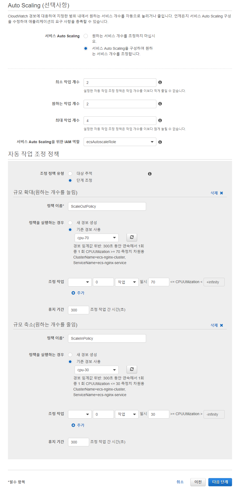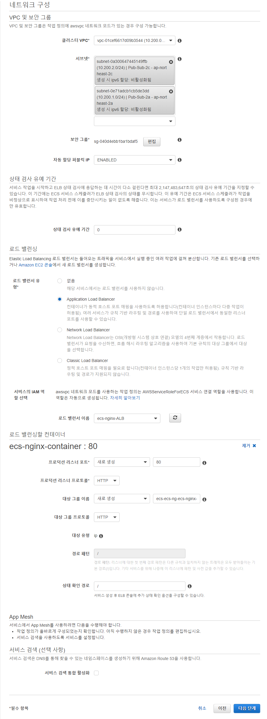 작업 정의에 맞는 서비스 생성 원하는 vpc, 서브넷, 보안 그룹 선택 그리고 이전에 만들어 두었던 ALB를 꼭 선택을 해줘야한다. 그리고 로드밸런서 편집을 눌러서 리스너 포트를 넣어준다 오토스케일링을 해줄 수 있다.