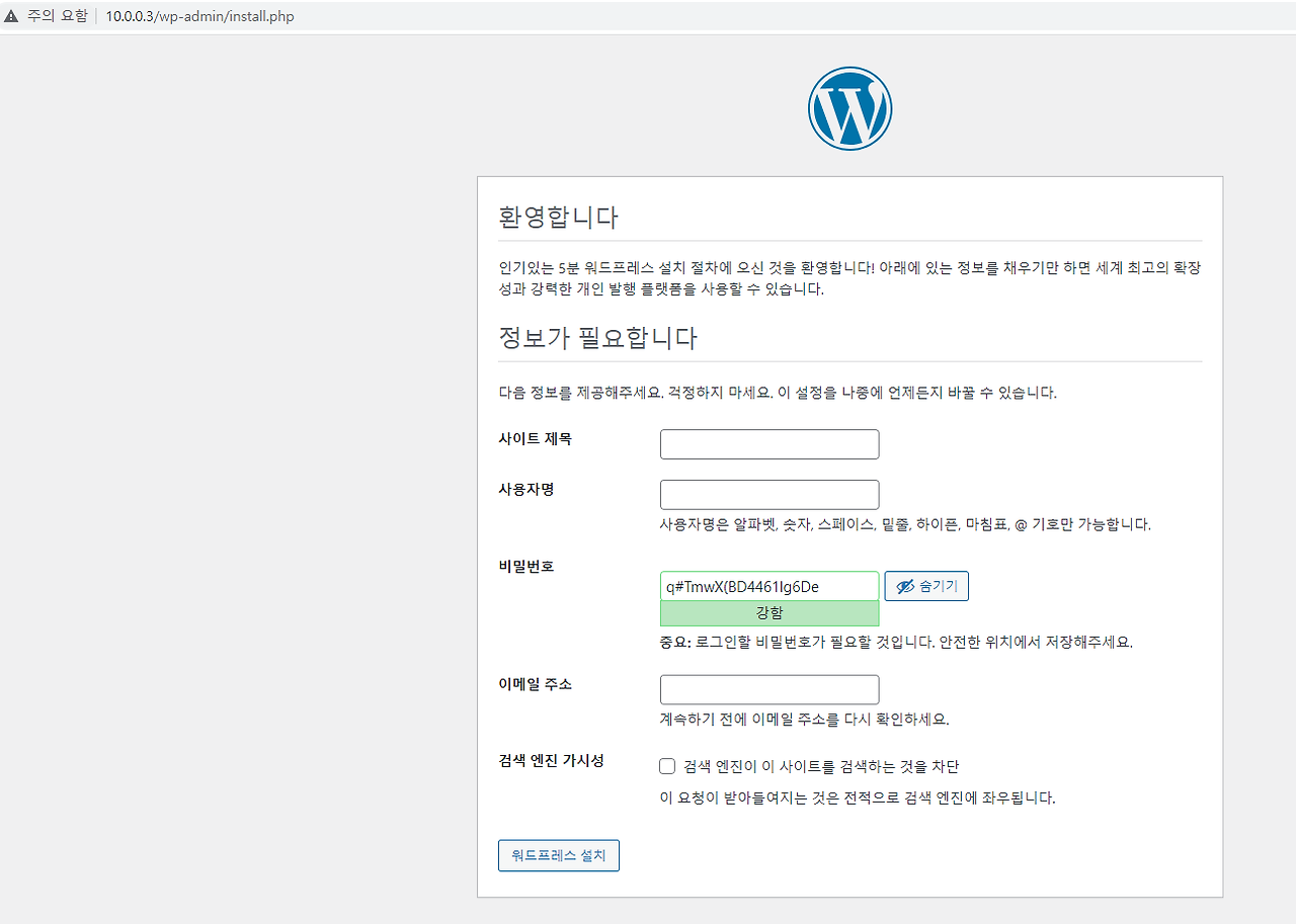 이렇게 설정을 다 마치면 proxy 설정을 해놓은 10.0.0.3에 접속하면 워드프레스 화면이 나옵니다.
