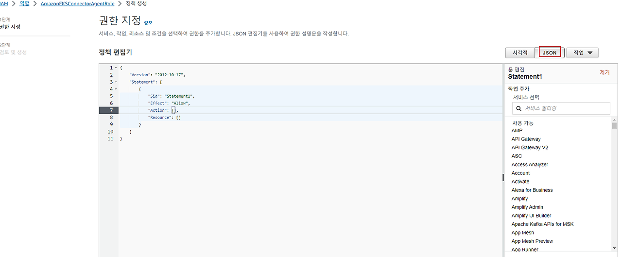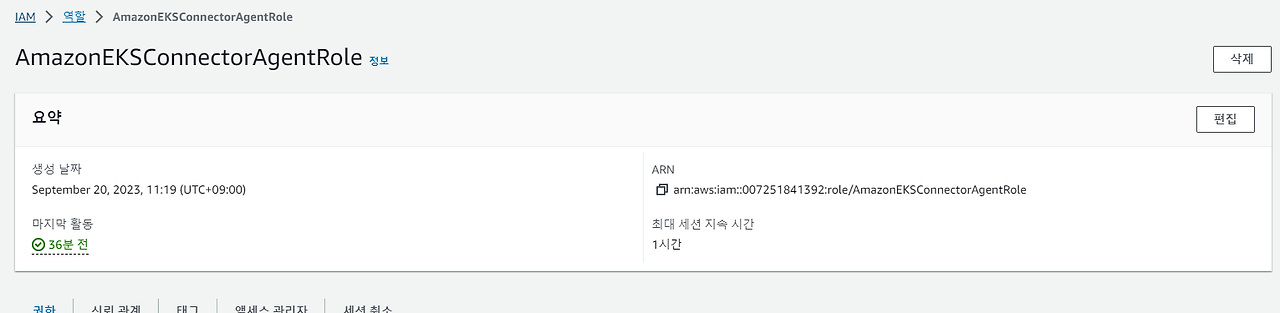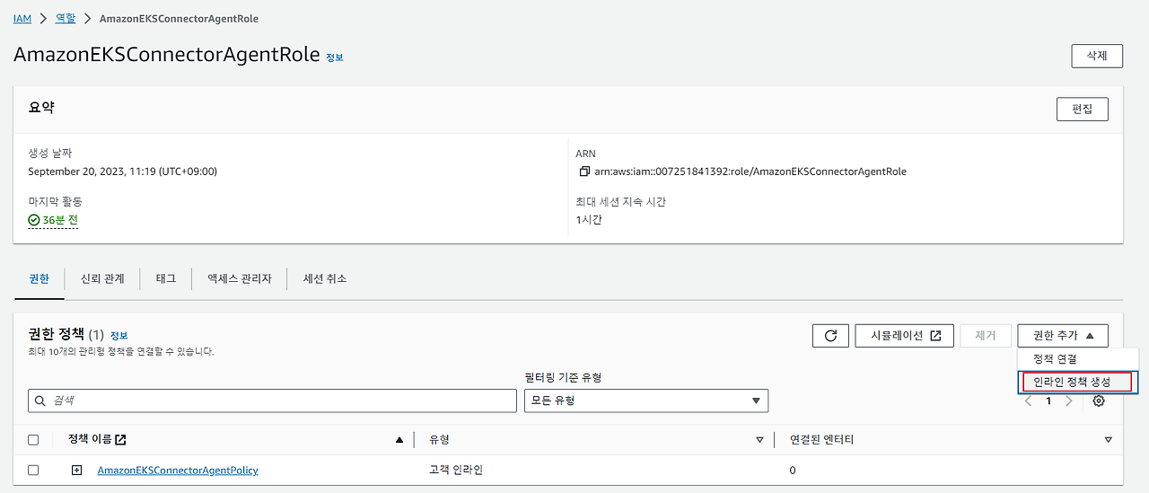 사용자 지정 신뢰 정책에는 Amazon EKS Connector IAM 역할을 넣어준다.