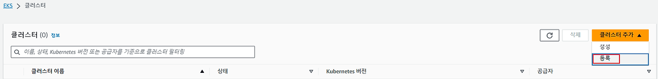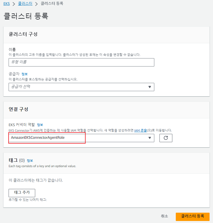 만들어둔 역할을 선택을 하고 이름을 정해준 후 클러스터 등록을 해주면 끝.