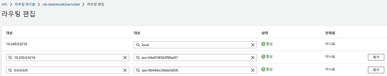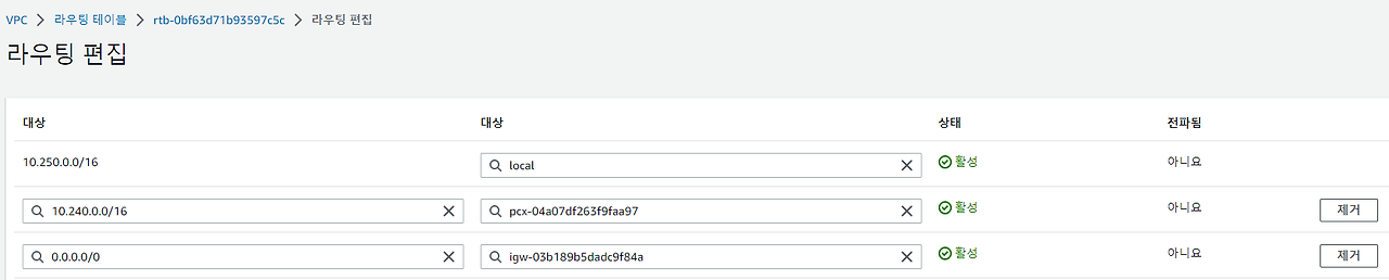 10.240.0.0/16 이 로컬인 라우팅 테이블에는 통신하려는 상대방의 VPC IP인 10.250.0.0/16을 대상에 넣고 피어링 연결을 선택해주면 된다.