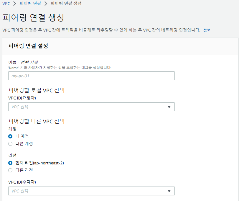 피어링할 로컬 VPC 선택에 피어링 통신을 하고 싶은 상대방의 VPC를 넣어주어야 한다.