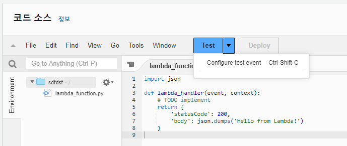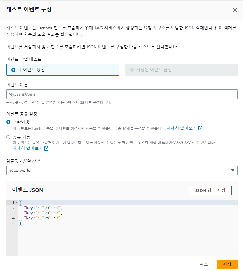 테스트 이벤트 구성을 해준후 Test 버튼을 눌러 테스트 해주면 끝이다.