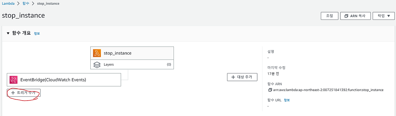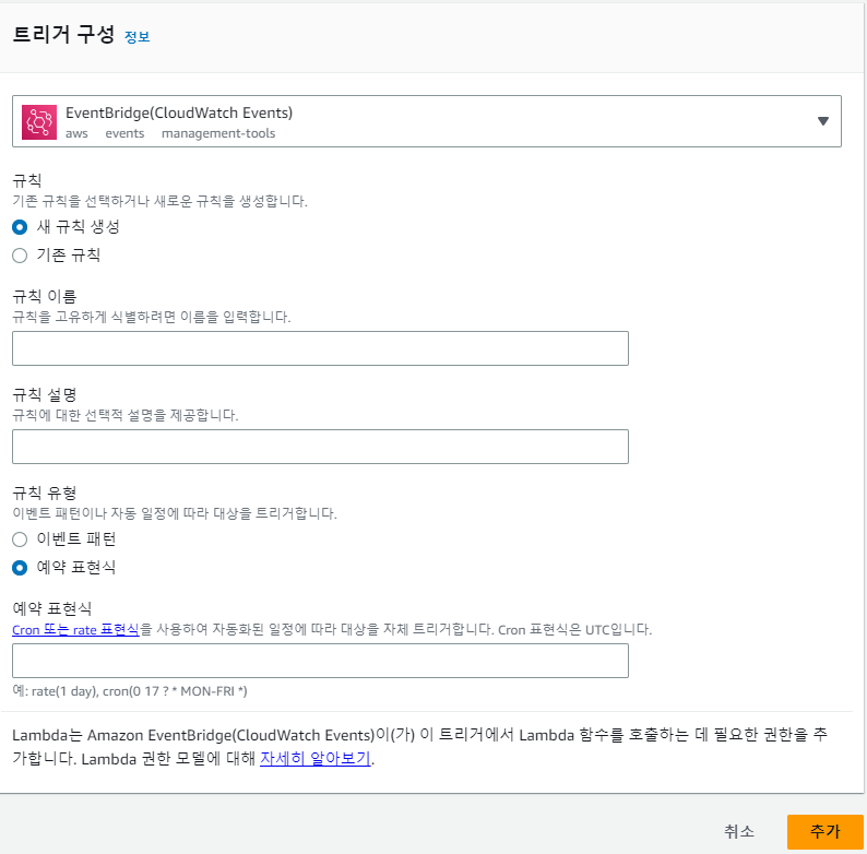 이벤트 브릿지 트리거로 선택을 하면 원하는 시간에 람다를 실행 할 수 있다.