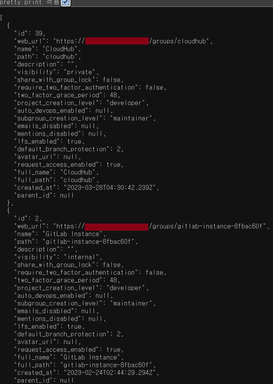 http://<Gitlab 주소>/api/v4/groups 를 URL 창에 넣어줍니다.