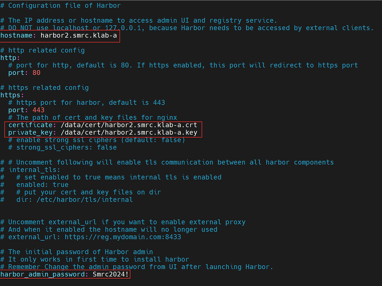 저는 여기서 hostname, certificate, private_key, harbor_admin_password 항목의 내용을 변경해주었습니다.