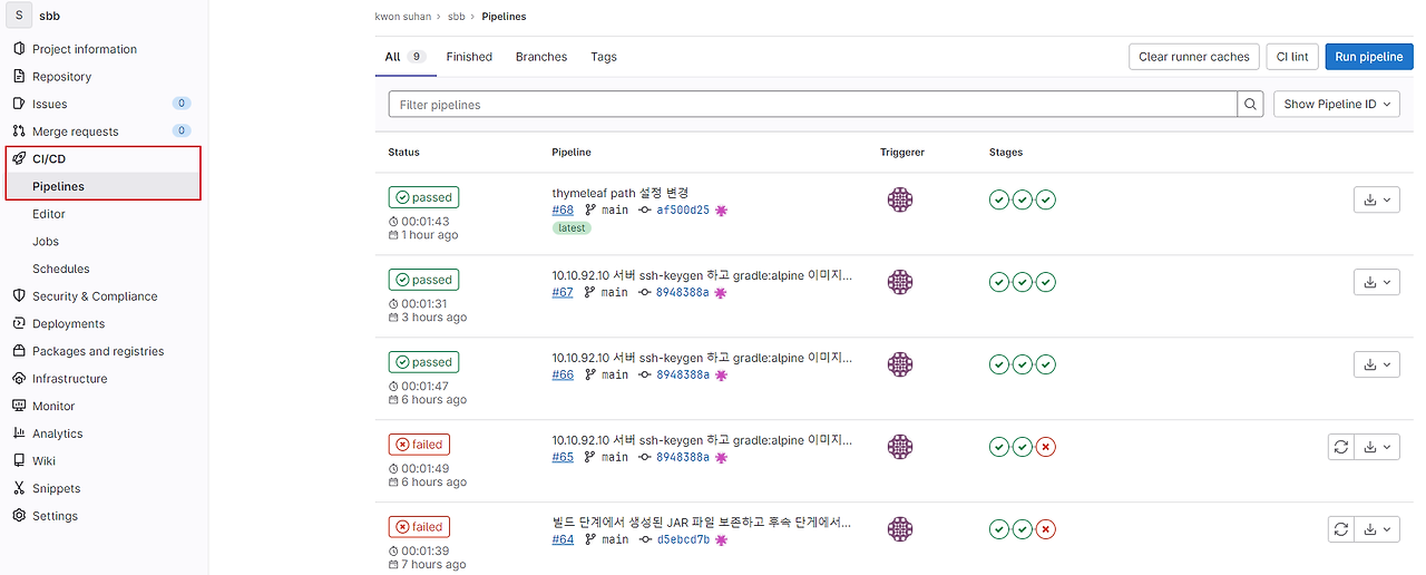 Gitlab 프로젝트에 들어와서 왼쪽 메뉴에 CI/CD -> Pipelines 클릭하면 그 동안 진행 되었던 과정들이 나옵니다.