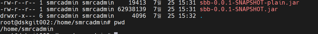 보시다시피 scp 명령어에서 정의한 디렉터리에 jar파일이 있는 것을 확인 할 수 있습니다.