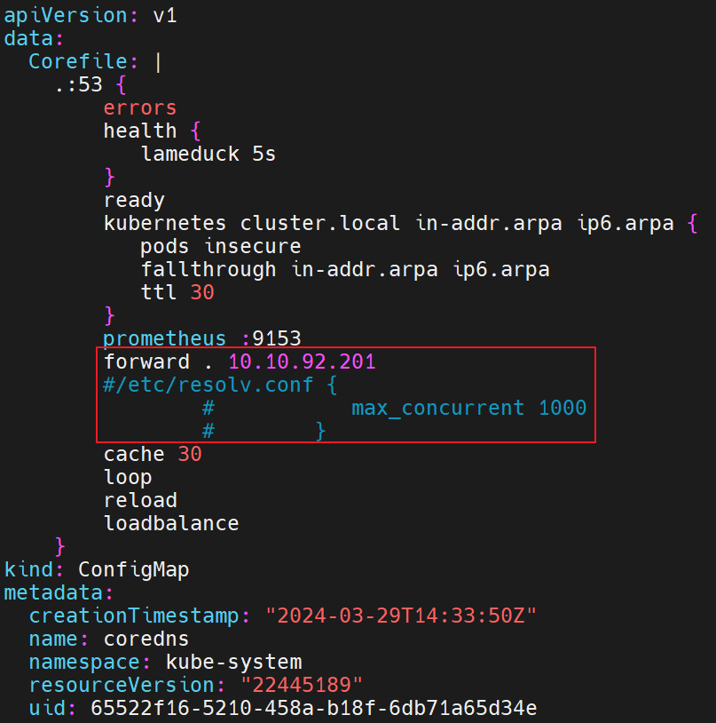 그래서 CoreDNS의 ConfigMap을 수정하여 다음과 같은 에러를 해결했습니다.
