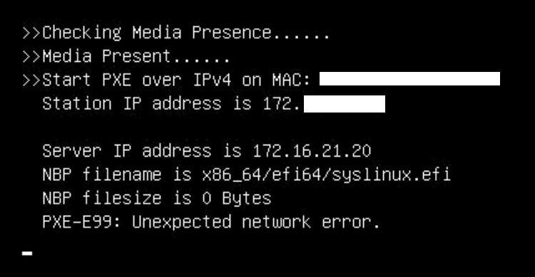PXE Boot를 시도 하던 도중 아래 이미지와 같은 에러가 발생하였습니다. 위와 같은 오류를 해결한 내용을 정리 해보도록 하겠습니다. 원인: tftpd.service 가 정상적으로 동작되고 있지 않음 tftpd.service가 정상적으로 동작되지 않던 이유는, PXE의 서버의 /run 디렉터리가 Full이 되어서 tftpd 서비스가 정상적으로 동작하지 않았습니다./run 디렉터리는, Linux 시스템에서 임시 파일,디렉터리를 저장하는 디렉터리 입니다. 해결 방법: (PXE 서버에서 할 것) 1. /run 디렉터리의 용량을 정리2. tftpd.socket 데몬 재시작3. tftpd.service 데몬 재시작 위 3가지를 해결하니 정상적으로 PXE Booting이 되었습니다.