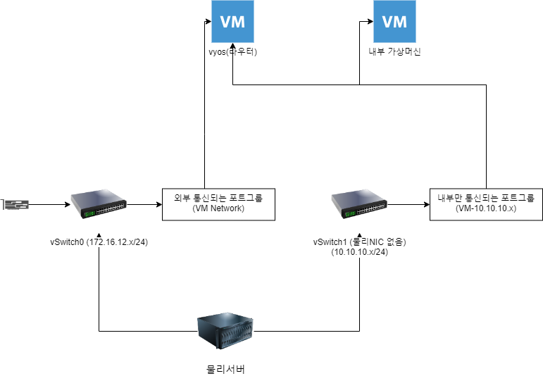 1. 아키텍처 현재 저의 구성도는 아래와 같습니다. 가상 스위치를 두 개를 생성하고 하나는 물리 NIC 카드를 넣지 않고 포트그룹만 생성을 해준다. 외부와 통신되는 IP 대역은 172.16.12.x/24 내부에서 사용되는 IP 대역은 10.10.10.x/24 위와 같이 설정할 예정입니다. 2. vyos 설치 미리 준비해둔 vyos.ova 파일을 배포 가상머신에 배포 해준다. 네트워크 매핑은 VM Network가 eth0, VM-10.10.10.x가 eth1 이 되도록 설정 3. vyos 설정 # configure => 설정 모드로 진입 # set interfaces ethernet eth0 address "172.16.12.221/24" # set interfaces ethernet eth0 descri..