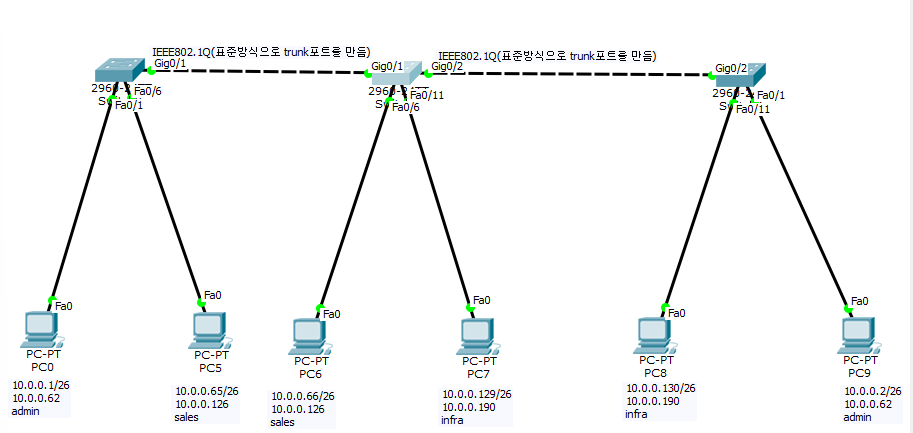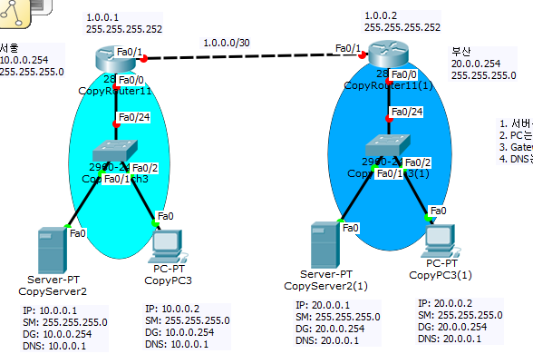 오늘은 DHCP 설정을 실제 구성에서 어떻게 설정을 해야하는지 알아보겠습니다. 기본 세팅은 아래 그림과 같습니다. 맨 왼쪽은 L3 스위치로 구성을 하였습니다. L3 스위치에서 DHCP 서비스를 하도록 설정을 해주었습니다. 초기 IP 값은 그림에 있는 것 처럼 하였지만 나중엔 DHCP를 통해 자동으로 할당받는 것을 보겠습니다. 명령어 왼쪽 L3 스위치 설정 enable conf ter int vlan1: vlan 1번 포트에 PC, Server가 연결되있기 때문에 vlan1로 접속 ip add 1.0.0.254 255.255.255.0: 1.0.0.0 게이트웨이 설정 no shutdown: interface 설정하면 습관적으로 하기 exit int f0/24 ip add 10.0.0.1 255.255.25..