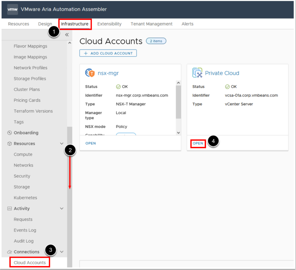 VMware Aria Automation Assembler란? vRealize Automation용 청사진 엔진인 Assembler 이다. Assembler는 생성한 시스템, 애플리케이션 및 서비스를 해당 리소스에 배포할 수 있도록 공용 및 사설 클라우드 공급업체에 연결하는 데 사용된다. Cloud Account Cloud Account는 Aria Automation Assembler가 지역 또는 데이터 센터에서 데이터를 수집하고 해당 지역에 클라우드 템플릿을 배포하는 데 사용됩니다. 나중에 클라우드 영역, 매핑 및 프로필을 구성할 때 해당 항목이 연결된 클라우드 계정을 선택한다. 아래의 사진에서 보면 Private Cloud는 vCenter와 연결이 된 계정임을 알 수 있다. 조금 더 자세히 알아보면,..